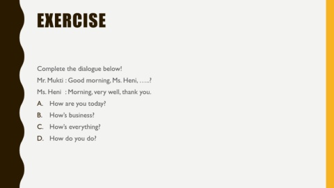 EXERCISE Complete the dialogue below! Mr. Mukti : Good morning, Ms. Heni, …..? Ms. Heni : Morning, very well, thank you. A. How are you today? B. How’s business? C. How’s everything? D. How do you do?
