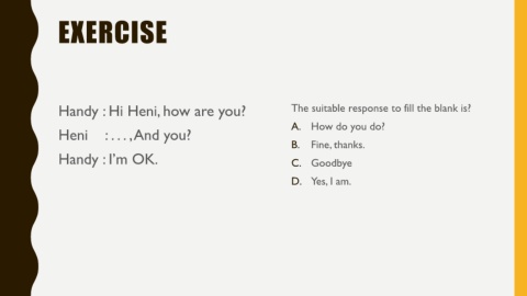 EXERCISE Handy : Hi Heni, how are you? The suitable response to fill the blank is? A. How do you do? Heni : . . . , And you? B. Fine, thanks. Handy : I’m OK. C. Goodbye D. Yes, I am.