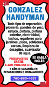 Todo tipo de reparación, plomería, paneles de yeso, estuco, pintura, pintura exterior, electricidad, techos, regadores para jardines, pisos, soldadura, cercas, limpieza de desagües, suavizador de agua.