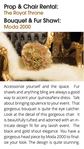 Accessorize yourself and the space. Fur shawls and anything bling are always a good way to accent your quinceaƱera dress. Talk about bringing opulence to your event. That gorgeous bouquet is quite the eye catcher. Look at the detail of this gorgeous chair. It is beautifully tufted and adorned with an in- tricate design fit for any lavish event. The black and gold shout elegance. You have a gorgeous head piece by Moda 2000 to final- ize your look. The design is quite stunning.
