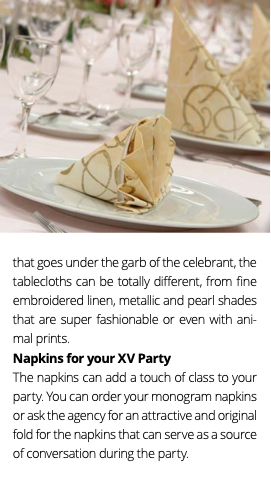 that goes under the garb of the celebrant, the tablecloths can be totally different, from fine embroidered linen, metallic and pearl shades that are super fashionable or even with ani- mal prints.
