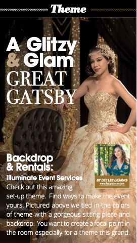 set-up theme. Find ways to make the event yours. Pictured above we tied in the colors of theme with a gorgeous sitting piece and backdrop. You want to create a focal point in the room especially for a theme this grand.