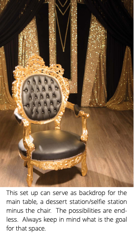 This set up can serve as backdrop for the main table, a dessert station/selfie station minus the chair. The possibilities are end- less. Always keep in mind what is the goal for that space.