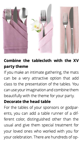 For the tables of your sponsors or godpar- ents, you can add a table runner of a dif- ferent color, distinguished other than the usual and give them special treatment for your loved ones who worked with you for your celebration. There are hundreds of op-