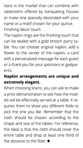 When choosing linens, you can ask to make a prior demonstration to see how the mod- els will be effectively served at a table. It re- quires them to show you different folds to pick the one you like. Remember that the cloth should be chosen according to the shape and size of the tables. For reference, the ideal is that the cloth should cover the entire table and drop at least one third of the distance to the floor. ◆
