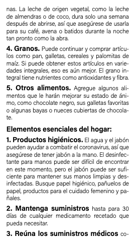 1. Productos higiénicos. El agua y el jabón pueden ayudar a combatir el coronavirus, así que asegúrese de tener jabón a la mano. El desinfec- tante para manos puede ser difícil de encontrar en este momento, pero el jabón puede ser sufi- ciente para mantener sus manos limpias y des- infectadas. Busque papel higiénico, pañuelos de papel, productos para el cuidado femenino y pa- ñales.