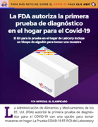 La Administración de Alimentos y Medicamentos de los EE. UU. (FDA) autorizó la primera prueba de diagnós- tico para el COVID-19 con una opción para tomar