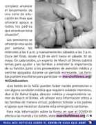 miércoles a las 6 p.m. y nuevamente los sábados a las 3 p.m. (hora del Este), desde el 29 de abril hasta el sábado 30 de mayo. En cada sesión, un experto de March of Dimes cubrirá temas para ayudar a las familias a entender la importancia de su función junto a los proveedores de atención médica y sentirse apoyados durante un período estresante. Las fami- lias pueden inscribirse para participar en marchofdimes.org/ NICUeducation.