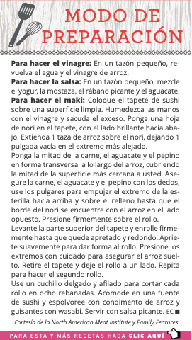 Para hacer la salsa: En un tazón pequeño, mezcle el yogur, la mostaza, el rábano picante y el aguacate. Para hacer el maki: Coloque el tapete de sushi sobre una superficie limpia. Humedezca las manos con el vinagre y sacuda el exceso. Ponga una hoja de nori en el tapete, con el lado brillante hacia aba- jo. Extienda 1 taza de arroz sobre el nori, dejando 1 pulgada vacía en el extremo más alejado.