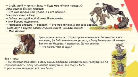 клюнула, Ёж Зайца иголками уколол, а Заяц Ворону ногой лягнул…