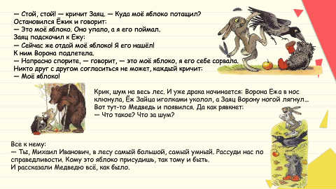 клюнула, Ёж Зайца иголками уколол, а Заяц Ворону ногой лягнул…