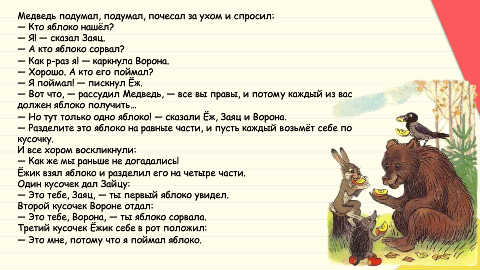 — Но тут только одно яблоко! — сказали Ёж, Заяц и Ворона.