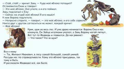 клюнула, Ёж Зайца иголками уколол, а Заяц Ворону ногой лягнул…