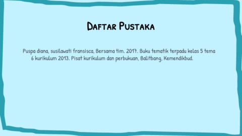 Daftar Pustaka Puspa diana, susilawati fransisca, Bersama tim. 2017. Buku tematik terpadu kelas 5 tema 6 kurikulum 2013. Pisat kurikulum dan perbukuan, Balitbang, Kemendikbud.