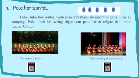 1. Pola horizontal. Pola lantai horizontal, yaitu penari berbaris membentuk garis lurus ke samping. Pola lantai ini sering digunakan pada tarian rakyat dan tarian tradisi. Contoh : —Someone Famous Tari saman ( Aceh ) Tari badinding (Sumatra Barat)