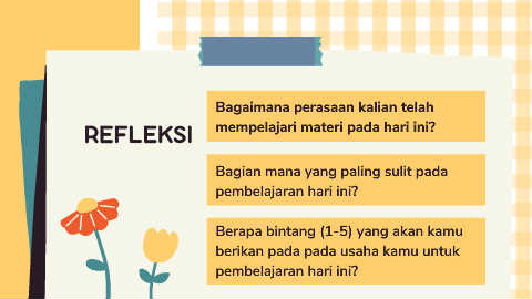Bagaimana perasaan kalian telah mempelajari materi pada hari ini? REFLEKSI Bagian mana yang paling sulit pada pembelajaran hari ini? Berapa bintang (1-5) yang akan kamu berikan pada pada usaha kamu untuk pembelajaran hari ini?