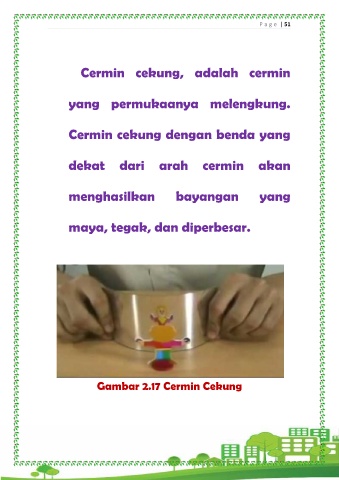 P a g e | 51 Cermin cekung, adalah cermin yang permukaanya melengkung. Cermin cekung dengan benda yang dekat dari arah cermin akan menghasilkan bayangan yang maya, tegak, dan diperbesar. Gambar 2.17 Cermin Cekung
