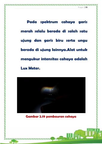 P a g e | 55 Pada spektrum cahaya garis merah selalu berada di salah satu ujung dan garis biru serta ungu berada di ujung lainnya.Alat untuk mengukur intensitas cahaya adalah Lux Meter. Gambar 2.19 pembauran cahaya