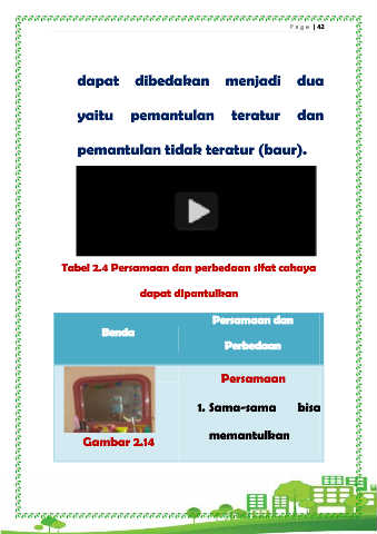 P a g e | 42 dapat dibedakan menjadi dua yaitu pemantulan teratur dan pemantulan tidak teratur (baur). Tabel 2.4 Persamaan dan perbedaan sifat cahaya dapat dipantulkan Persamaan dan Benda Perbedaan Persamaan 1. Sama-sama bisa memantulkan Gambar 2.14
