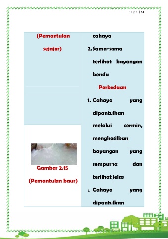 P a g e | 43 (Pemantulan cahaya. sejajar) 2.Sama-sama terlihat bayangan benda Perbedaan 1. Cahaya yang dipantulkan melalui cermin, menghasilkan bayangan yang sempurna dan Gambar 2.15 terlihat jelas (Pemantulan baur) 2. Cahaya yang dipantulkan