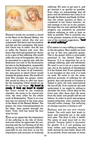 45Simeon%u2019s words are certainly a sword in the Heart of the Blessed Mother, butnot a mystery which She did not understand. She knew now her position and this was her consolation. She knew that Christ was to suffer, that He was to suffer the Passion and, now, She knew that God had granted her desire to be a part of that suffering. She wouldsuffer the cross of Compassion. She is to be associated in a special way with the Redeemer not only in the Incarnation but also in the Redemption, inseparably linked to the God-Man. It is as if her ownheart were the heart of all humanity; the wine-press in which Christ would trample the grapes alone. She would nothelp Him trample the grapes; rather She would be there to offer her heart for the trampling. Christ would set up His Cross in her heart. My heart is ready, O God; my heart is ready!Her heart would be the weddingchamber, the water to be turned into wine, the wine cellar for the whole work of Redemption. There is no vine that was not pressed in the wine press of the Heart of the Blessed Mother. Thegrapes, the wine transubstantiated on the Altar, have passed through her heart. Truly, God has saved the best wine for last. Even as we appreciate the importanceof the suffering in the Life of Christ, and even when we appreciate the outpouring and the out flowing of all this suffering, we find it extremely difficult, especially in our own lives, to see the importance and necessity of retaining suffering. We want to get past it, and get beyond it as quickly as possible. Even when we acknowledge that all grace and all salvation has come to us through the Passion and Death of Christ, that the whole mission of Mary iscontained in her Seven Sorrows, we still manage to live on in the counterfeit hope that our own spiritual life andprogress can somehow be achieved without suffering or with at least as little as possible. This is certainly one of the greatest weapons of the enemy, one of his constant suggestions: %u201cseek to avoid suffering!%u201dOur nature is a very willing accompliceto this deception. How readily we lend an ear to this new pain-free gospel. This is the gospel which is principally preached in the United States of America. It is so important for us to undergo suffering, pain and self-denial.We need to see it not as a more noble way, but as the bedrock of Christianity! It is the bottom line! If our spiritual life is not founded on this rock, it is built on sand. We need to see the metaphysical necessity of suffering for all growth. Any real growth in Creation is linked to pain; not only supernatural life but all life. If we could see this and understand it, we might be willing to shoulder the Cross. Christ died on the Cross and, after three days, He arose from the dead, and people still do not believe. In order to grow and progress toward perfection, every creature must literally suffer change. The suffering of change requires a dying to self. Sadness and joy are very closelylinked. The only path that leads togreat and immortal joy is the path over pain. The door to Life is death! The grain of seed must fall to the ground. Tension (pain) is necessaryfor growth. If it is not pushing out from within and extending beyond itself, beyond its own limits, there will be no growth. Every increase of virtue