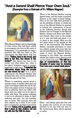 44The Blessed Mother had no knowledgeto what extent She had been calledto accompany her Son in His work of Redemption. It is practically an Isaac%u2019s question that fills her heart as She approaches the High Priest with her Child: %u201cFather, here is the wood, and here is the fire, but where is the victim?%u201d She knows her Son is the victim, but what about her, what is her place? Scripture seems to answer negatively to her query. %u201cI trampled thewine-press alone, from the people no one stood by me.%u201dIt is a greatsuffering for the Blessed Mother that perhaps She may not be permitted to share the pain of her Son. There is something special about a woman%u2019s heart. A mother often does notseem to be happy unless she can be sad. This is the nature of love. If anyone you love is suffering, then you suffer with them, and you suffer not to be able to suffer with them. The greater sufferingis not to be allowed to share in their suffering and pain. Yet, her humility was so great, She scarcely dare lift that request up to God. If we couldgive it expression, perhaps it would be like this: Father, if it is possible, grant that I share in this chalice; yet not my will, but Thy Will be done.Here is the Blessed Mother hopingagainst hope, and her hope is granted. Simeon is the angel of good tidings. Even as his eyes had been granted to see the salvation of Israel, so would theeyes of the Blessed Mother be granted to behold the redemption of Israelin the Suffering Servant. Recall that Simeon was no stranger to the Blessed Mother. Simeon and Anna were Mary%u2019sbest friends. Mary went to the temple as a 3-year old child and spent 11 or 12 years in the temple. Here are the two great saints in the temple at the time of the Incarnation. The Blessed Mother naturally gravitated to these two elderly people who were like her special grandparents. When Simeon came to meet the Blessed Motherbringing in the Child, She naturally offered her Child to him. Simeon took up the Child and said, %u201cHe will be a sign of contradiction so that the thoughts of many may be revealed. Your own soul a sword shall pierce.%u201d Glad -sad tidings; glad that She willbe spared the sorrow of not being allowed to be one with her Son in His victim-hood. Mary will be allowedto suffer.