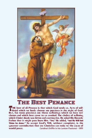 HEbest of all Penance is that which God sends us. Acts of selfdenial which we freely choose are precious in the sight of God. But, far more precious are those sufferings which we have notchosen and which have come to us unasked. The chalice of sufferingwhich Christ drank was bitter and unattractive. He asked His HeavenlyFather that it might pass from Him. %u201cYet,%u201d He added, %u201cnot My Will butThine be done.%u201d To accept God%u2019s Will, without complaint, is the greatest contribution that any Christian can make to the cause of world peace. Cardinal Griffin in his Lenten Pastoral -1951