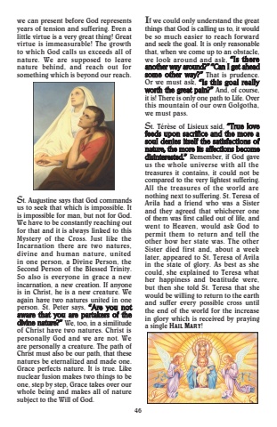 46we can present before God represents years of tension and suffering. Even a little virtue is a very great thing! Great virtue is immeasurable! The growthto which God calls us exceeds all of nature. We are supposed to leave nature behind, and reach out for something which is beyond our reach. St. Augustine says that God commandsus to seek that which is impossible. It is impossible for man, but not for God. We have to be constantly reaching out for that and it is always linked to this Mystery of the Cross. Just like theIncarnation there are two natures, divine and human nature, unitedin one person, a Divine Person, theSecondPerson of the Blessed Trinity. So also is everyone in grace a newincarnation, a new creation. If anyoneis in Christ, he is a new creature. We again have two natures united in oneperson. St. Peter says, %u201cAre you not aware that you are partakers of the divine nature?%u201d We, too, in a similitudeof Christ have two natures. Christ ispersonally God and we are not. We are personally a creature. The path of Christ must also be our path, that thesenatures be eternalized and made one. Grace perfects nature. It is true. Like nuclear fusion makes two things to be one, step by step, Grace takes over our whole being and makes all of nature subject to the Will of God. If we could only understand the great things that God is calling us to, it wouldbe so much easier to reach forwardand seek the goal. It is only reasonable that, when we come up to an obstacle, we look around and ask, %u201cIs thereanother way around?%u201d%u201cCan I get aheadsome other way?%u201dThat is prudence. Or we must ask, %u201cIs this goal really worth the great pain?%u201d And, of course, it is! There is only one path to Life. Over this mountain of our own Golgotha, we must pass. St. T%u00e9r%u00e8se of Lisieux said, %u201cTrue love feeds upon sacrifice and the more a soul denies itself the satisfactions of nature, the more its affections becomedisinterested.%u201d Remember, if God gaveus the whole universe with all thetreasures it contains, it could not be compared to the very lightest suffering.All the treasures of the world are nothing next to suffering. St. Teresa of Avila had a friend who was a Sister and they agreed that whichever one of them was first called out of life, andwent to Heaven, would ask God to permit them to return and tell theother how her state was. The other Sister died first and, about a weeklater, appeared to St. Teresa of Avila in the state of glory. As best as she could, she explained to Teresa what her happiness and beatitude were, but then she told St. Teresa that she would be willing to return to the earth and suffer every possible cross until the end of the world for the increase in glory which is received by praying a single Hail Mary!