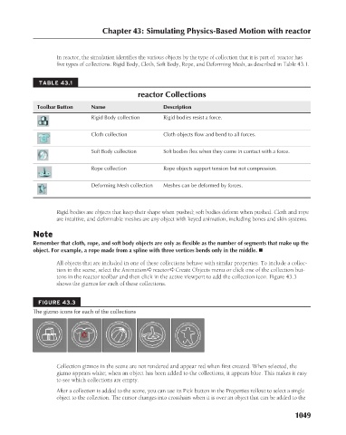 five types of collections: Rigid Body, Cloth, Soft Body, Rope, and Deforming Mesh, as described in Table 43.1.