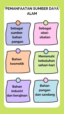 PEMANFAATAN SUMBER DAYA ALAM Sebagai Sebagai sumber obat- bahan obatan pangan Memenuhi Bahan kebutuhan kosmetik sehari-hari Bahan Bahan industri pangan dan kerajinan dan sandang