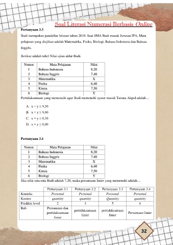 Jika nilai rata-rata Budi adalah 7,20, maka persamaan linier yang memenuhi adalah....