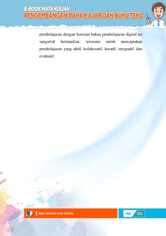 pembelajaran dengan bantuan bahan pembelajaran digital ini sangatlah bermanfaat, terutama untuk menciptakan pembelajaran yang aktif, kolaboratif, kreatif, integratif, dan evaluatif. BAB X BAHAN AJAR DIGITAL 525