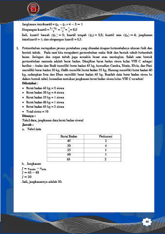 dalam bentuk tabel, kemudian tentukan jangkauan berat badan siswa kelas VIII C tersebut!