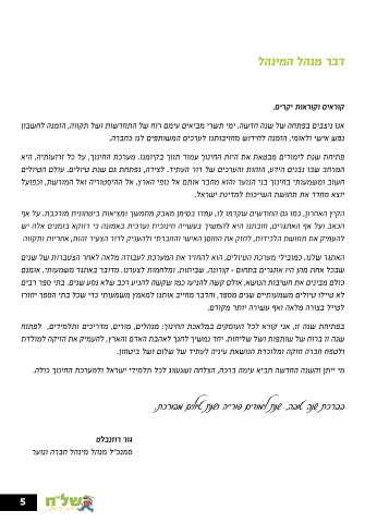 שנה זו ברוח של שותפות ושל שליחות .יחד נמשיך לחנך לאהבת האדם והארץ ,להעמיק את הזיקה למולדת