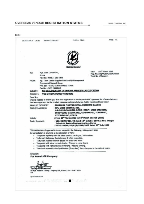OVERSEAS VENDOR REGISTRATION STATUS WISE CONTROL INC. KOC