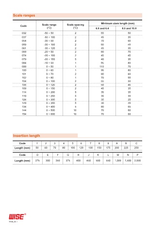 Code Scale range Scale spacing Minimum stem length (mm)