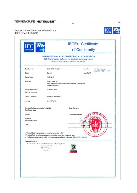 TEMPERATURE INSTRUMENT 062 Explosion Proof Certificate - Flame Proof (IECEx Ex d IIC T6 Gb)