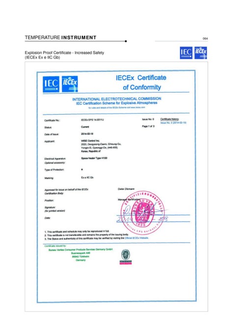 TEMPERATURE INSTRUMENT 064 Explosion Proof Certificate - Increased Safety (IECEx Ex e IIC Gb)