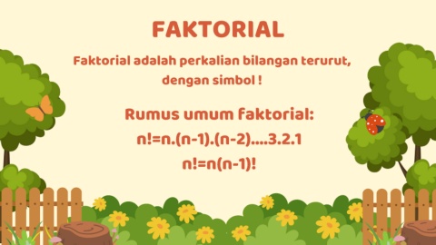 FAKTORIAL Faktorial adalah perkalian bilangan terurut, dengan simbol ! Rumus umum faktorial: n!=n.(n-1).(n-2)....3.2.1 n!=n(n-1)!