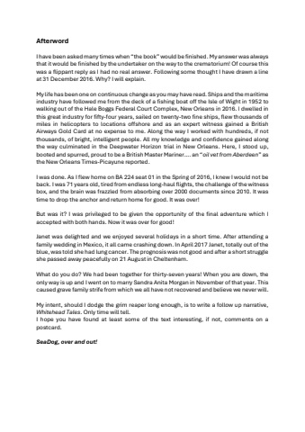 AfterwordI have been asked many times when %u201cthe book%u201d would be finished. My answer was always that it would be finished by the undertaker on the way to the crematorium! Of course this was a flippant reply as I had no real answer. Following some thought I have drawn a line at 31 December 2016. Why? I will explain.My life has been one on continuous change as you may have read. Ships and the maritime industry have followed me from the deck of a fishing boat off the Isle of Wight in 1952to walking out of the Hale Boggs Federal Court Complex, New Orleans in 2016. I dwelled in this great industry for fifty-four years, sailed on twenty-two fine ships, flew thousands of miles in helicopters to locations offshore and as an expert witness gained a British Airways Gold Card at no expense to me. Along the way I worked with hundreds, if not thousands, of bright, intelligent people. All my knowledge and confidence gained along the way culminated in the Deepwater Horizon trial in New Orleans. Here, I stood up,booted and spurred, proud to be a British Master Mariner%u2026. an %u201coil vet from Aberdeen%u201d as the New Orleans Times-Picayune reported. I was done. As I flew home on BA 224 seat 01 in the Spring of 2016, I knew I would not be back. I was 71 years old, tired from endless long-haul flights, the challenge of the witness box, and the brain was frazzled from absorbing over 2000 documents since 2010. It was time to drop the anchor and return home for good. It was over!But was it? I was privileged to be given the opportunity of the final adventure which I accepted with both hands. Now it was over for good!Janet was delighted and we enjoyed several holidays in a short time. After attending a family wedding in Mexico, it all came crashing down. In April 2017 Janet, totally out of the blue, was told she had lung cancer. The prognosis was not good and after a short struggle she passed away peacefully on 21 August in Cheltenham.What do you do? We had been together for thirty-sevenyears! When you are down, the only way is up and I went on to marry Sandra Anita Morgan in November of that year. This caused grave family strife from which we all have not recovered and believe we never will. My intent, should I dodge the grim reaper long enough, is to write a follow up narrative, Whitehead Tales. Only time will tell. I hope you have found at least some of the text interesting, if not, comments on a postcard. SeaDog,over and out!