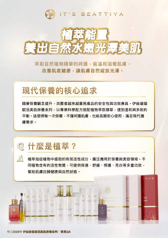 植萃能量 養出自然水嫩光澤美肌 隨著保養觀念提升,消費者越來越重視產品的安全性與功效兼具。伊絲碧媞 賦活美肌保養系列,以專業科學配方搭配植物萃取精華,達到溫和與多效的 平衡。這使得每一次保養,不僅呵護肌膚,也能長期安心使用,滿足現代護 膚需求。 植萃指從植物中提取的有效活性成分,廣泛應用於保養與美容領域。不 同植物含有的活性物質,可提供保濕、舒緩、修護、亮白等多重功效, 幫助肌膚回歸健康與自然狀態。 11 | 202511 伊絲碧媞賦活美肌保養系列.常見QA