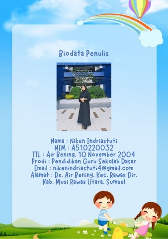 Biodata Penulis Nama : Niken Indriastuti NIM : A510220032 TTL : Air Bening, 10 November 2004 Prodi : Pendidikan Guru Sekolah Dasar Email : nikenindriastuti4@gmail.com Alamat : Ds. Air Bening, Kec. Rawas Ilir, Kab. Musi Rawas Utara, Sumsel