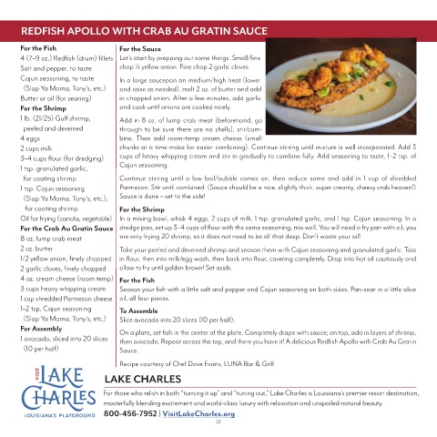 1 avocado, sliced into 20 slices then avocado. Repeat across the top, and there you have it! A delicious Redfish Apollo with Crab Au Gratin