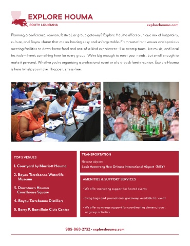 Planning a conference, reunion, festival, or group getaway? Explore Houma offers a unique mix of hospitality,