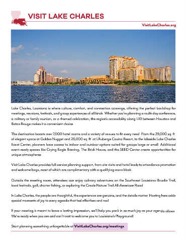 Visit Lake Charles provides full-service planning support, from site visits and hotel leads to attendance promotion