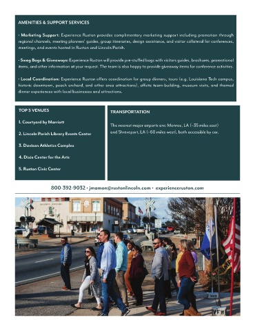 • Local Coordination: Experience Ruston offers coordination for group dinners, tours (e.g. Louisiana Tech campus,