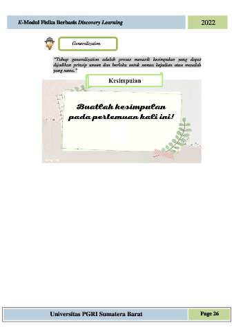 E-Modul Fisika Berbasis Discovery Learning 2022 Generalization “Tahap generalization adalah proses menarik kesimpulan yang dapat dijadikan prinsip umum dan berlaku untuk semua kejadian atau masalah yang sama.” Universitas PGRI Sumatera Barat Page 26