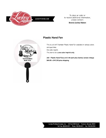 250 - Plastic Hand Fans at $1.49 each plus factory screen charge