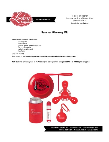 100 - Summer Giveaway Kits at $8.72 each plus factory screen charge $230.00 = $1,102.00 plus shipping