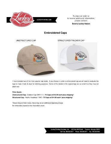 I have included two of the most popular cap styles. If you choose to order a embroidered cap we will need to evaluate the